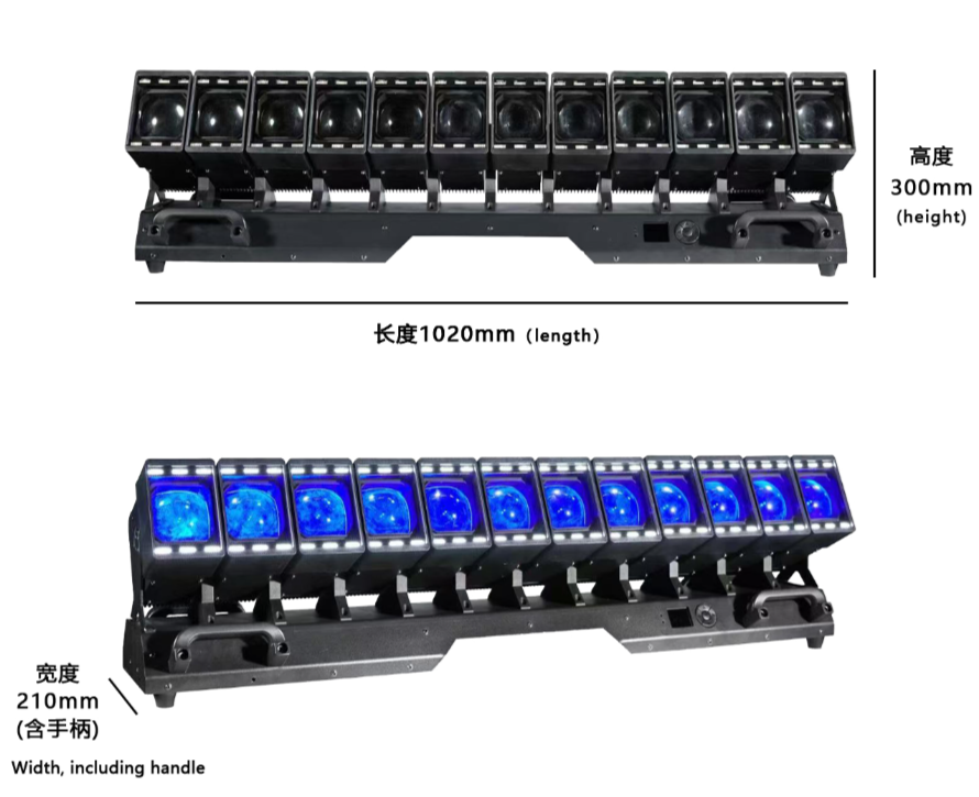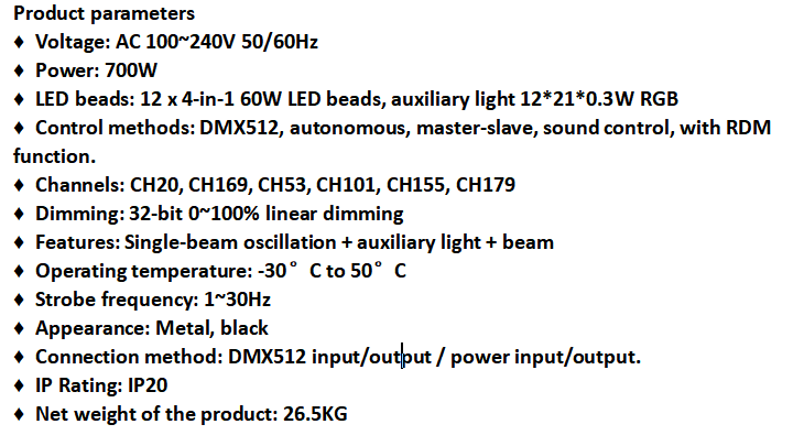 Light source:12 x 60W LED beads, auxiliary light 12*21*0.3W RGB